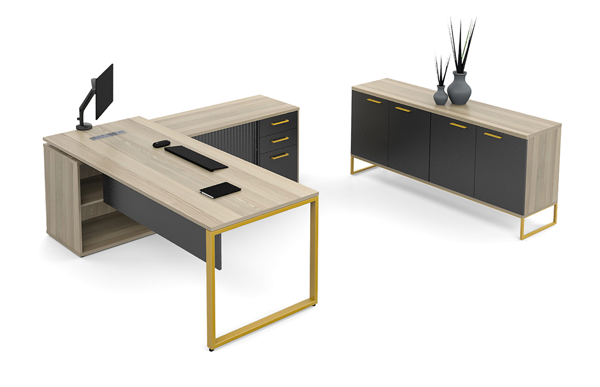 With a two-tone desk, modesty panel and the Mada leg, this executive workstation provides a modern and streamlined design