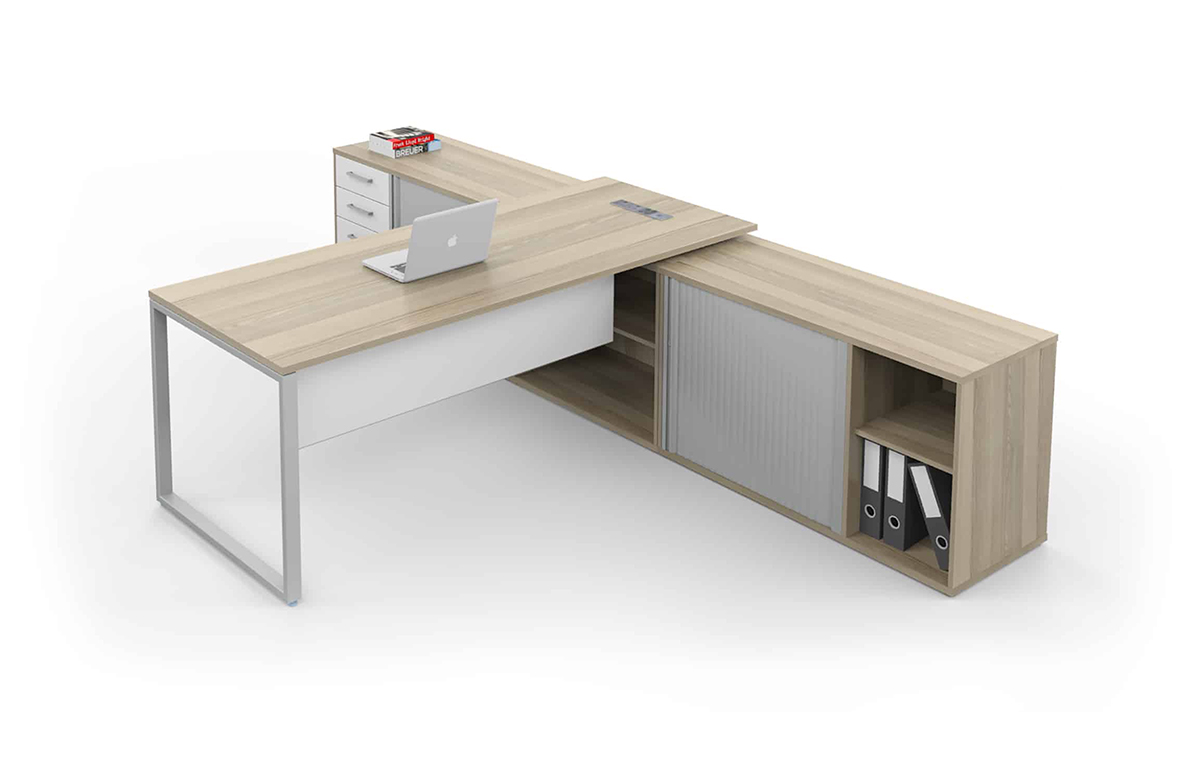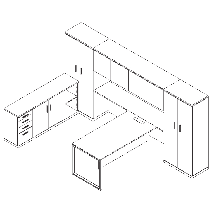 Executive two x hinge-door cabinets, executive worktop, overhead storage in glass or wood with pinboard and executive pedenza cabinet.